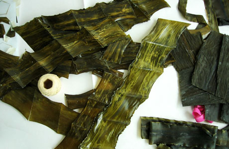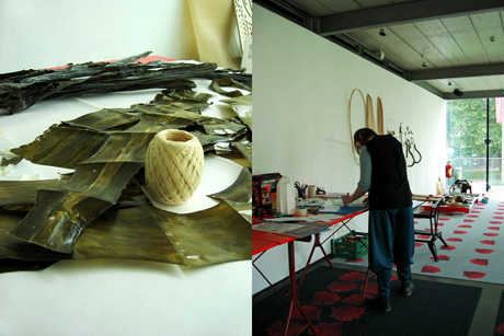 This exhibition presented within vast glass walls of Kunsthalle (literally “Space for art”) is a work and vision of multidisciplinary designer Julia Lohmann. Julia Lohmann is a professor at the University of Fine Arts in Hamburg where she restlessly develops a completely new world of magic intended for all. At the same time she is a researcher at the Department of Design Products at the Royal College of Art in London. Her research is currently focused on development of materials and shapes made from kelp.